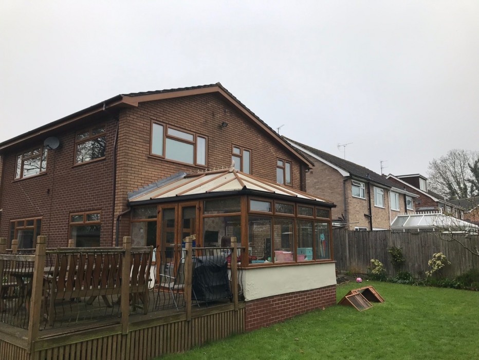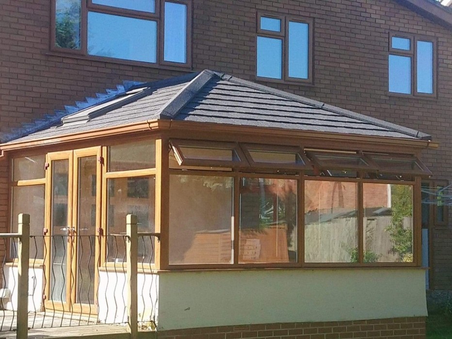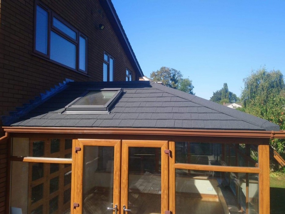 Here we have replaced the old polycarbonate roof with energy efficient Guardian Warm Roof in a charcoal metrotile.